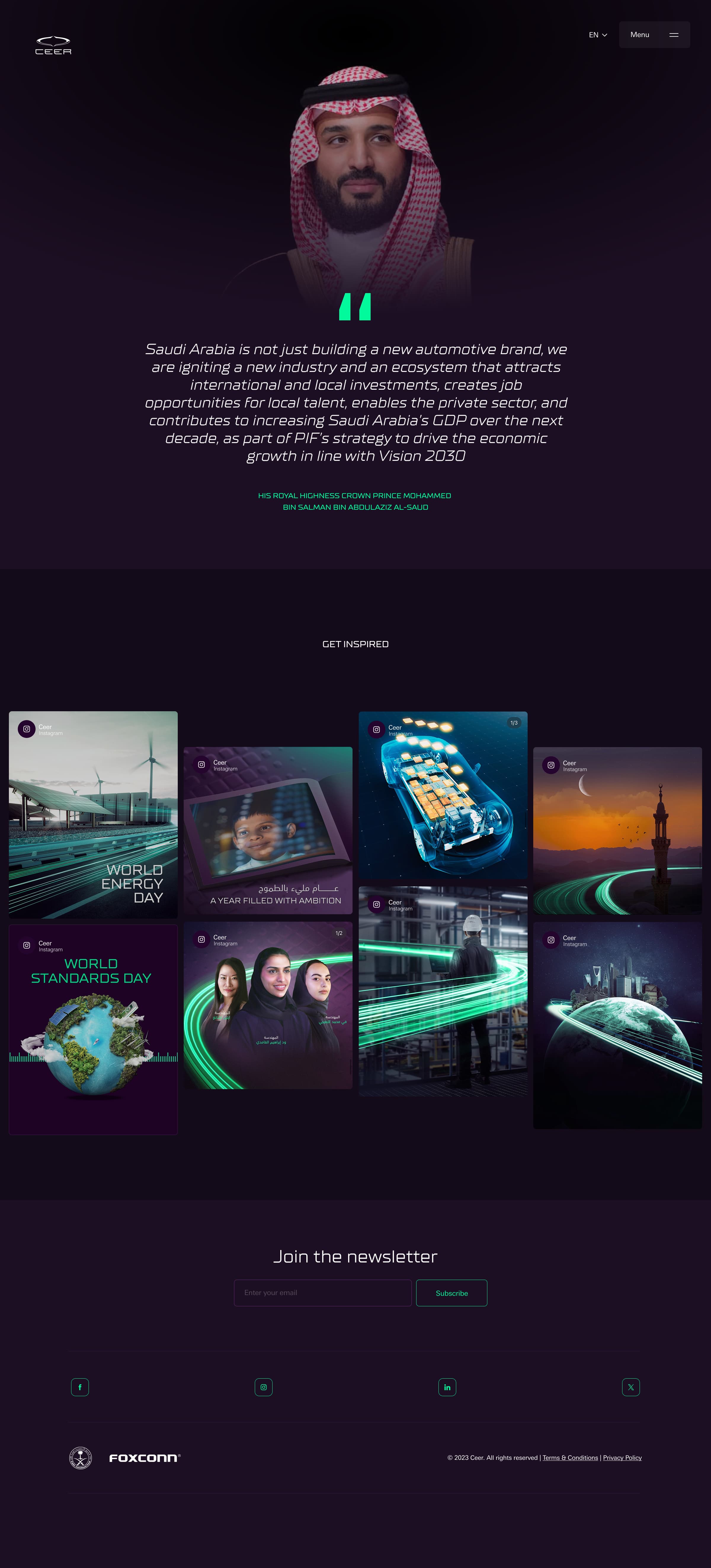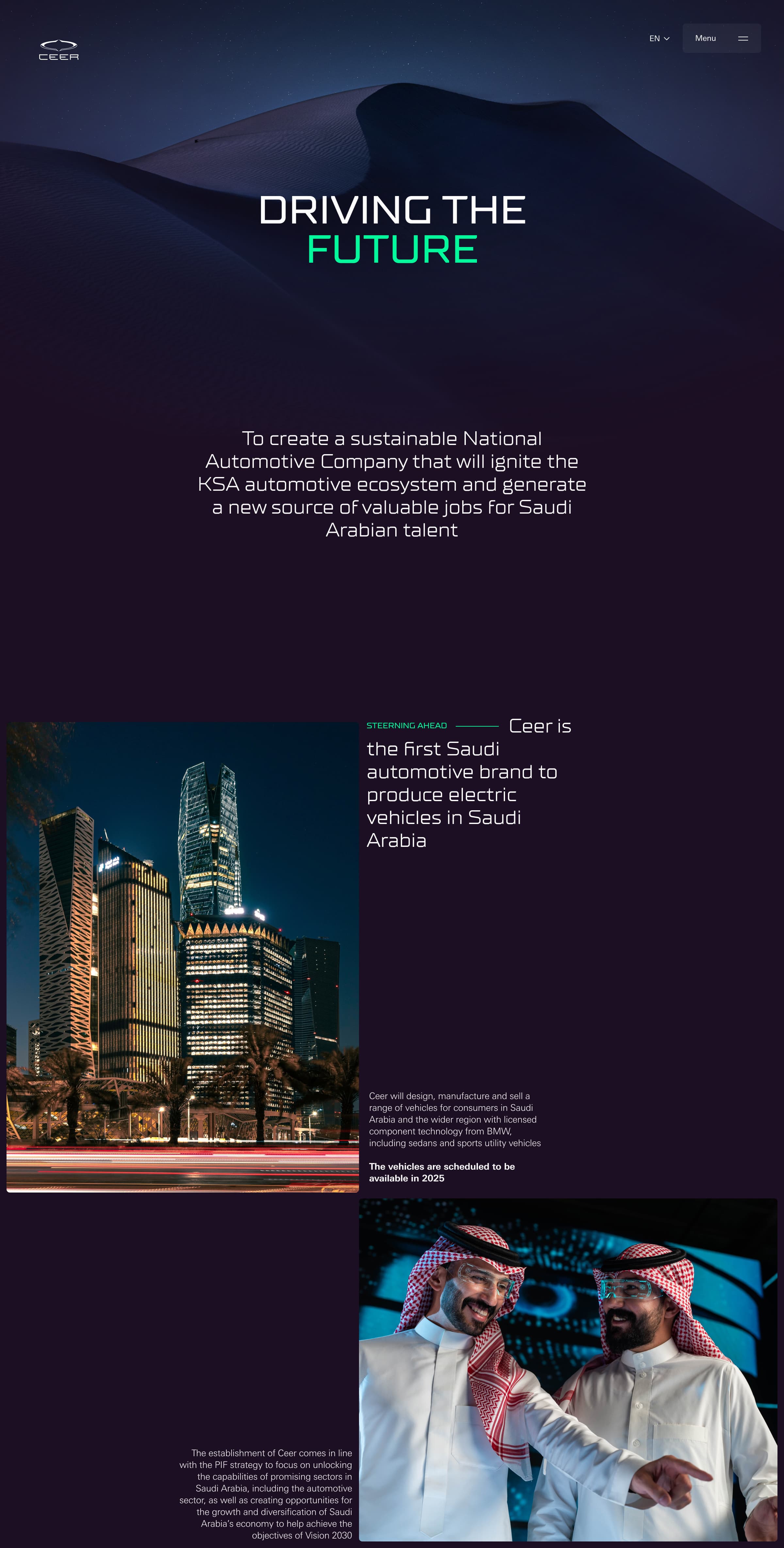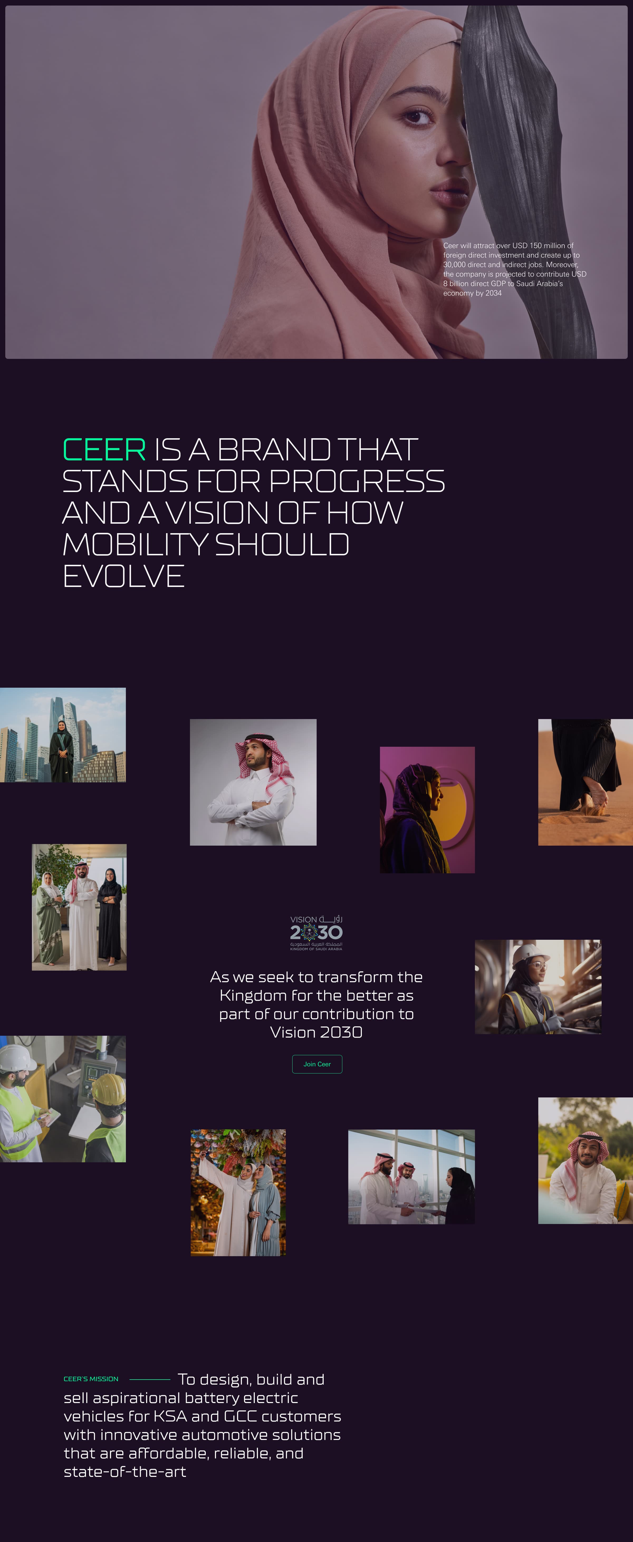 The challenge was to design and develop Ceer’s global launch website for early 2024. The goal was to communicate its focus on technology and sustainability in an innovative and emotional way, emphasizing its connection to Saudi identity and its vision for the future.