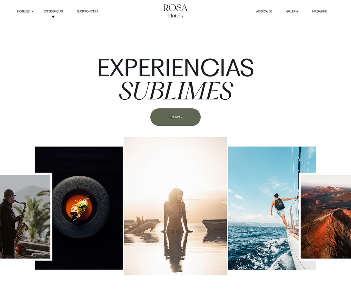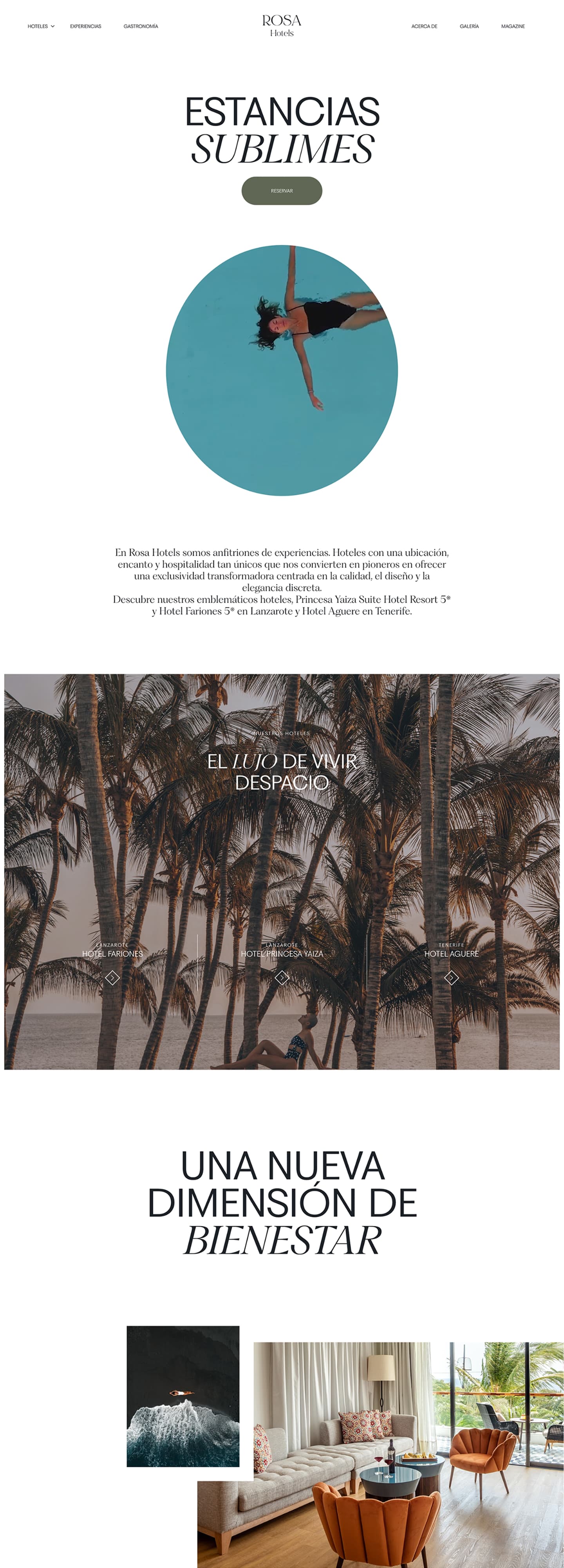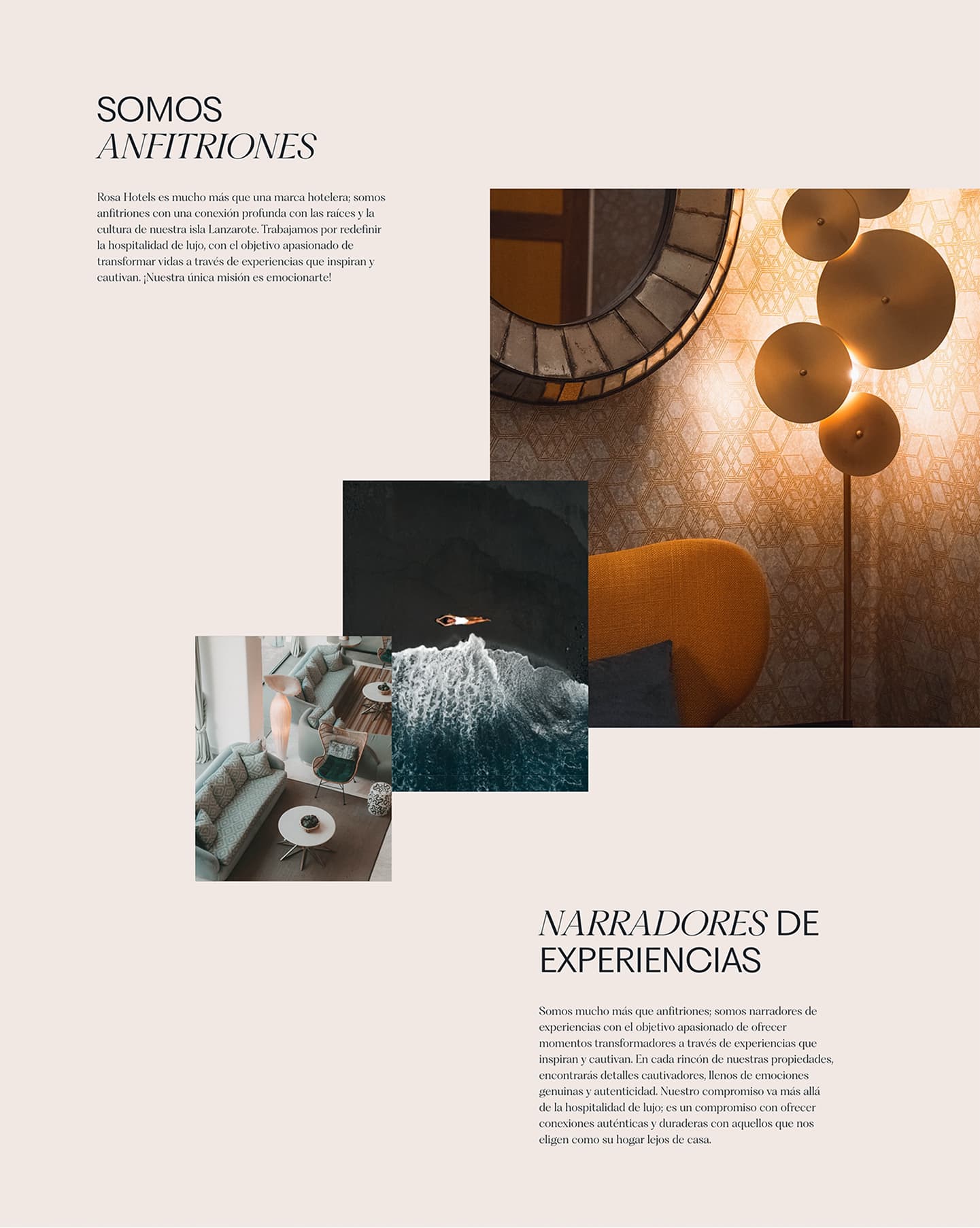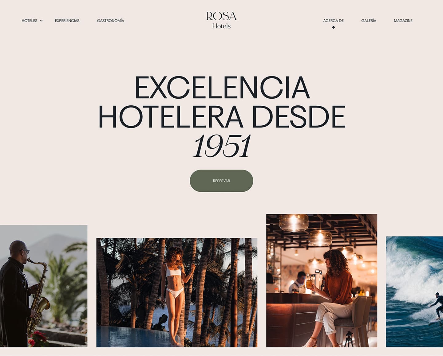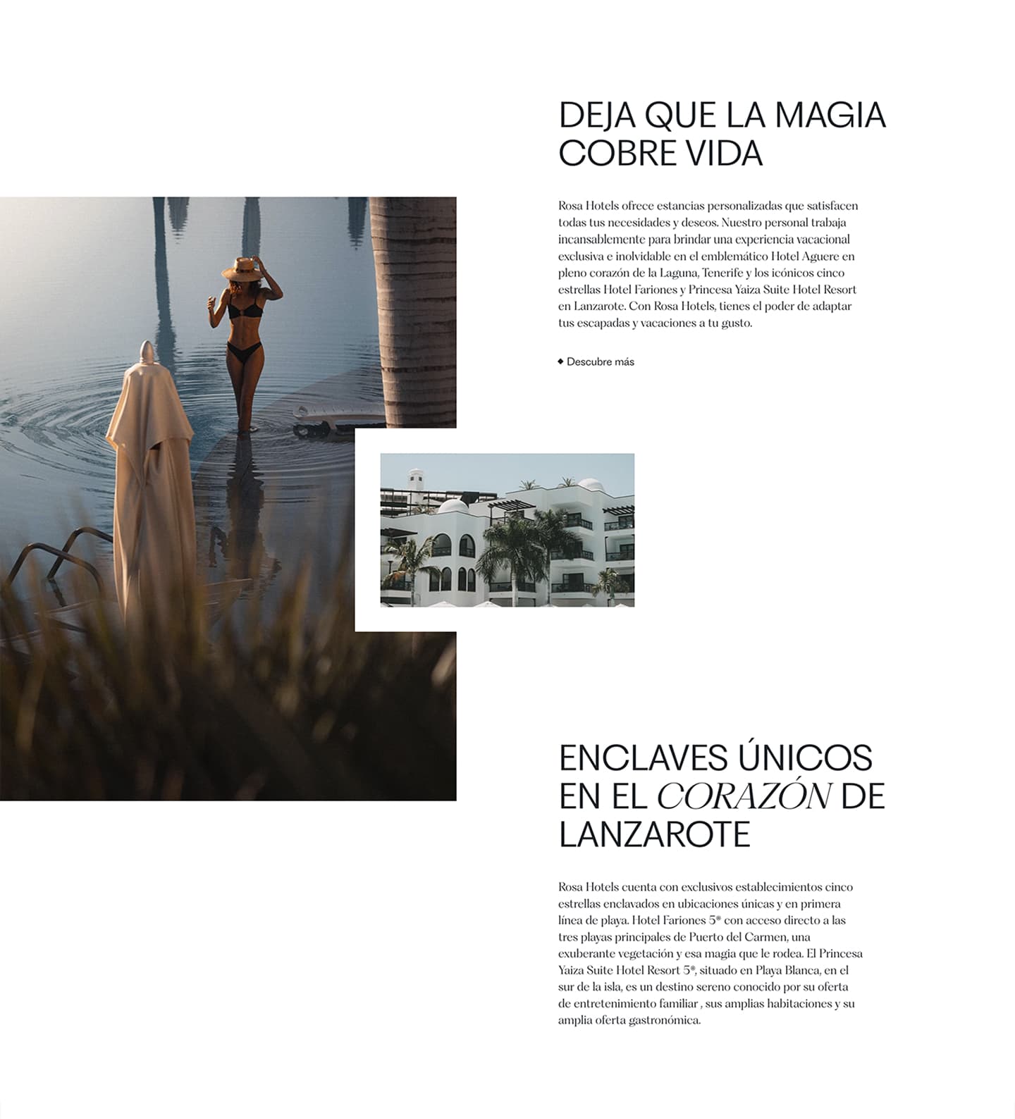 Rosa Hotels is the hotel division of Rosa Group, a benchmark for premium tourism in Lanzarote. It is part of an ecosystem of brands—Rosa Gastro, Rosa Origins, Rosa Boutiques, and Rosa Leisure & Wellness—that share the same standards of luxury and quality. The project focuses on Rosa Hotels, ensuring coherence with the parent brand without losing its own identity.